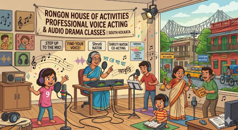 If you have been searching for “voice acting classes near me” or want to master the art of Shruti Natok (audio drama), step up to the mic at Rongon House of Activities! Located centrally in Santoshpur, our studio offers specialized training for aspiring voice artists, storytellers, and podcasters. In today’s booming digital age of audiobooks, animation, and podcasts, your voice is your greatest asset. Whether your child loves creating funny character voices or you are an adult wanting to build a professional voiceover portfolio, our expert mentors will help you bring scripts to life.